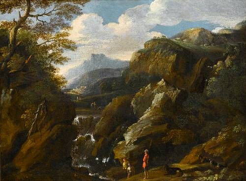 An Italianate landscape with a goatherd and his flock beside a waterfall