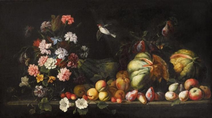 | Flowers in a vase by fruit on a ledge with a bird; and Fruit and flowers on a ledge | |