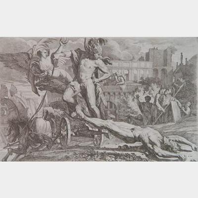 Pietro Testa (Italian 1612-1650)- ''Achilles Dragging the Body of Hector around the Walls of Troy'' (Bartsch 22); (Bellini 37); (Cropper 121iv)- etching and drypoint, c.1648-1650, narrow to small margins, a good impression on handmade paper. 11 x 16 | |