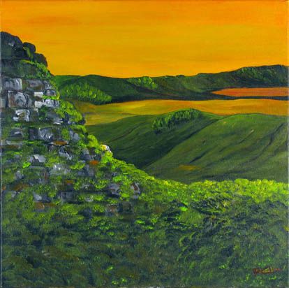 Überwachsene Ruine vor weiter, sonnendurchglühter Landschaft