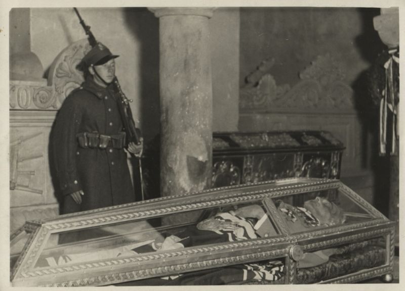 Przeszklona trumna z ciałem Józefa Piłsudskiego na Wawelu, obok żołnierz pełniący wartę honorową