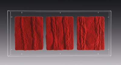 pittura su 3 elementi 31x25 cm cadauno, (totale 31x72 cm), firma, titolo e anno al retro dell'elemento 1, dichiarazione d'autenticità dell'artista e Archivio Pino Pinelli (MI) su foto, entro teca in plexiglass. | |