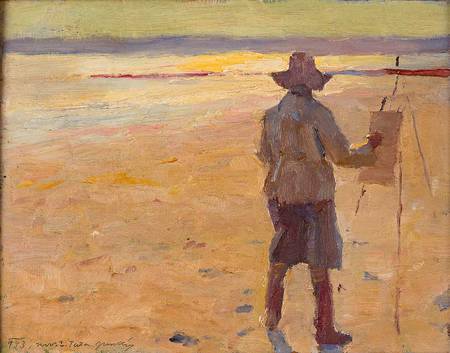 | The painter Béla Juszkó with easel on the bank of the 'Old Lake' of the Hungarian small town Tata | |
