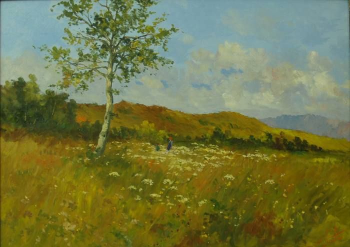Blumenpflückerei auf Wiese in Sommerlandschaft