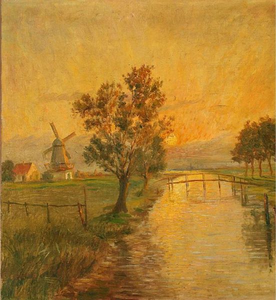 Landscape with a stream and a mill in the evening sun.