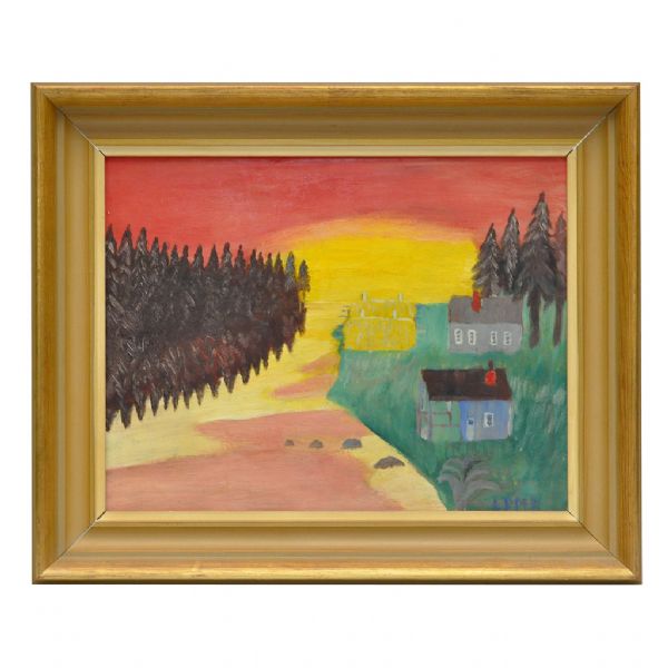 Motiv av 3 hus invid vatten och skog framför solnedgång