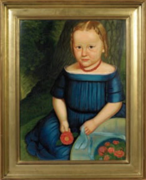 FOLK PORTRAIT OF BLONDE GIRL IN BLUE DRESS HOLDING ROSE FILLED BONNET.
