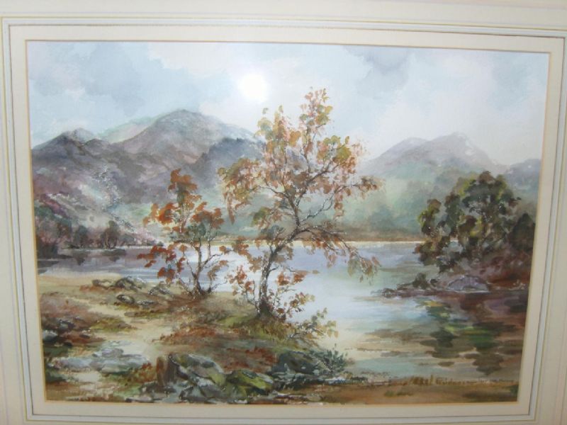 A Highland landscape with lake, trees, mountains, etc