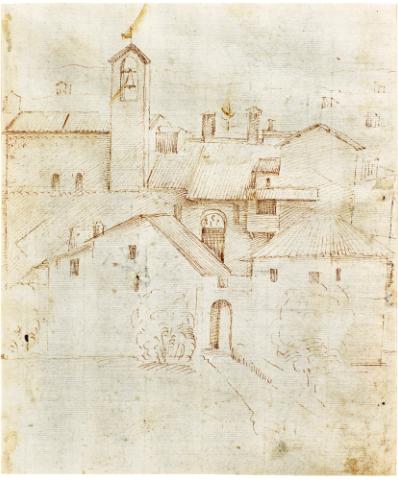 | RECTO: VIEW OF HOUSES AND A CHURCH WITH A CAMPANILE; VERSO: A GROUP OF CLERICS AND MONKS SINGING IN FRONT OF A LECTERN | |