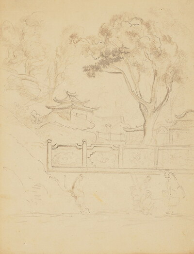 | Quatre vues de Chine : Bateaux à Macao, Un voilier, Deux chinois assis devant leur maison, Temple dans un paysage | |