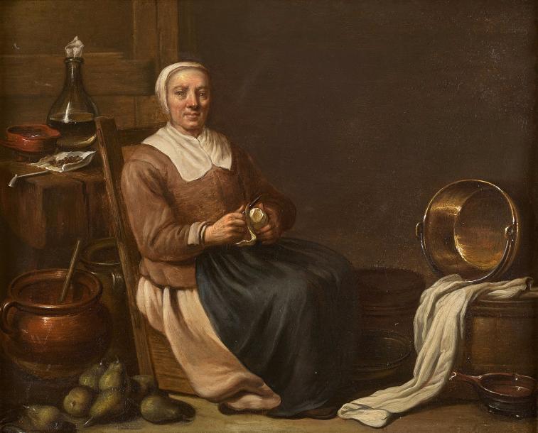 | Femme épluchant une poire dans un intérieur de cuisine | |