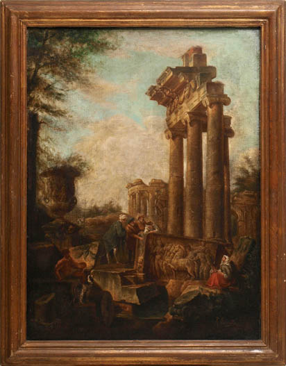 Gruppe von Personen vor einer Tempelruine bei der Betrachtung eines Reliefs