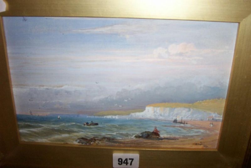 | a costal scene with white cliffs, figures in a rowing boat, figures seated on the rocks etc | |