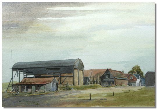 Farmyard scene with barn and farmhouse