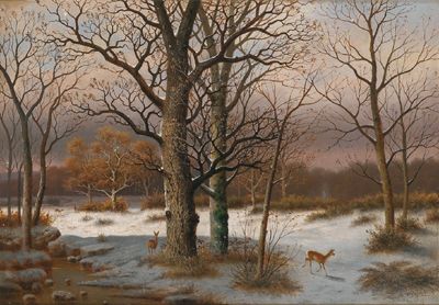 Red Deer in a Winter Woodland