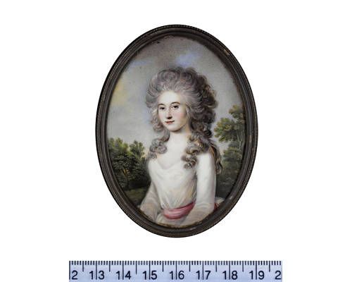 | Miss Blackburn, wearing white dress with cerise sash, her powdered hair worn long and curling over her shoulders, landscape back | |