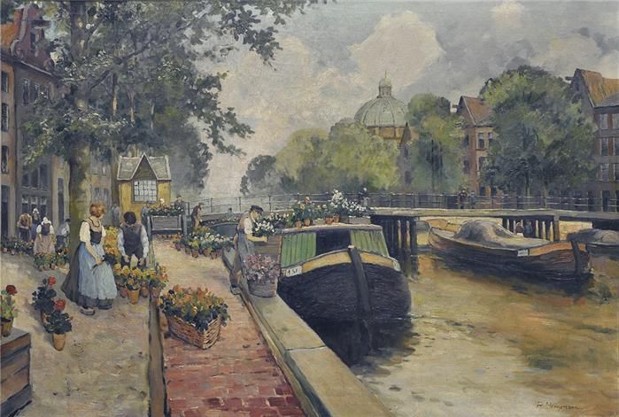 Belebter, holländischer Blumenmarkt an einem Kanallauf.