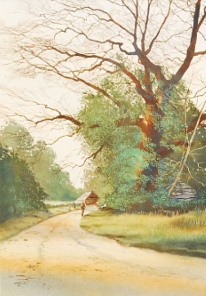 Figures on a country road with buildings in the distance