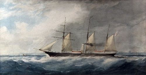 Ship portrait - Three masted steam ship in choppy seas off coast