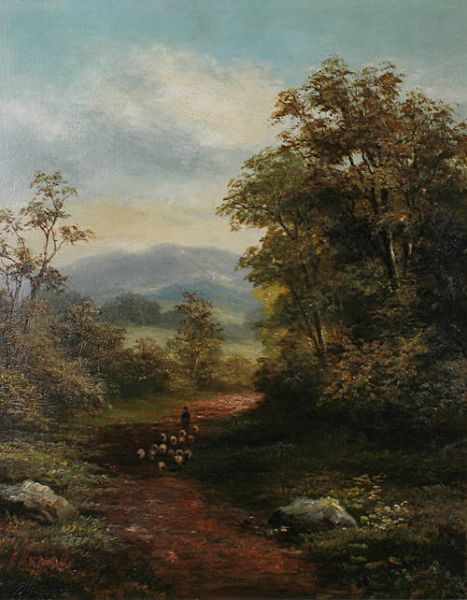 | Figure and sheep in a country land; Figure and dog in a country lane | |