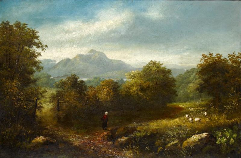 MOUNTAINOUS LANDSCAPE WITH A FIGURE ON A WINDING PATH