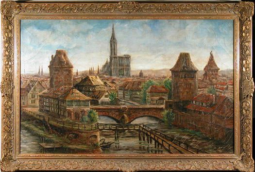 | Blick über das Quartier des tanneurs auf das Straßburger Münster unter sommerlich bewölktem Himmel | |