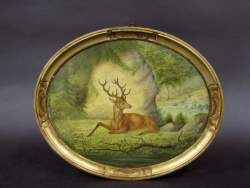 Auf einer Waldlichtung liegender Hirsch. Ovaler Bildausschnitt.