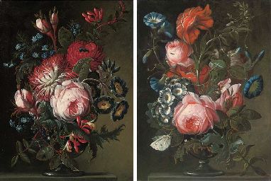 | Roses, forget-me-nots, morning glory and other flowers in a glass vase on a stone ledge; and Roses, morning glory, peonies and o | |