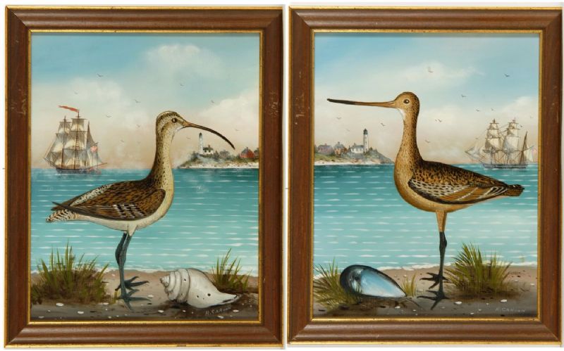 Pair of shorebird portraits, one depicting a curlew and the other a godwit