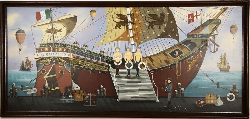 | The Italian ship S.S. Raffaello at dock with numerous mermaids disembarking, sailors, hot air balloons, etc | |
