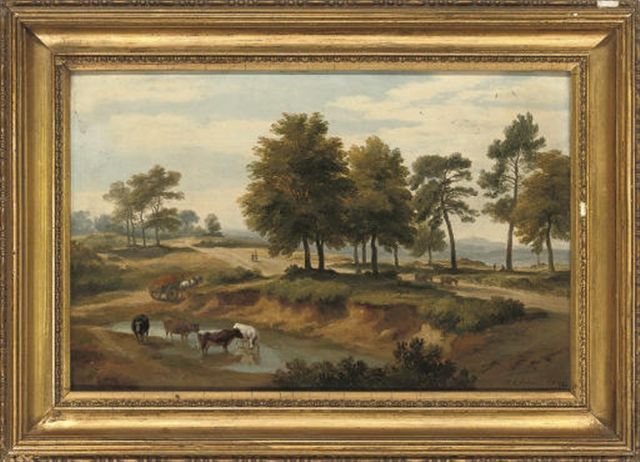 | An extensive wooded river landscape with cattle watering, figures on a path beyond | |