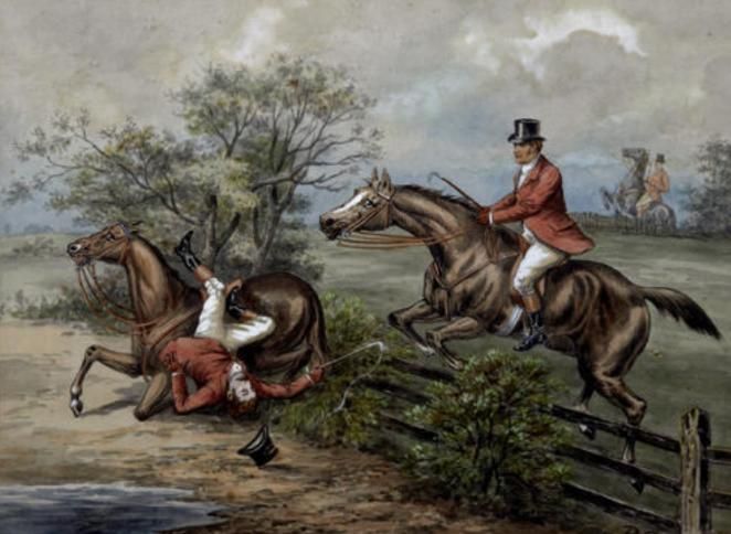 Two huntsmen at a fence