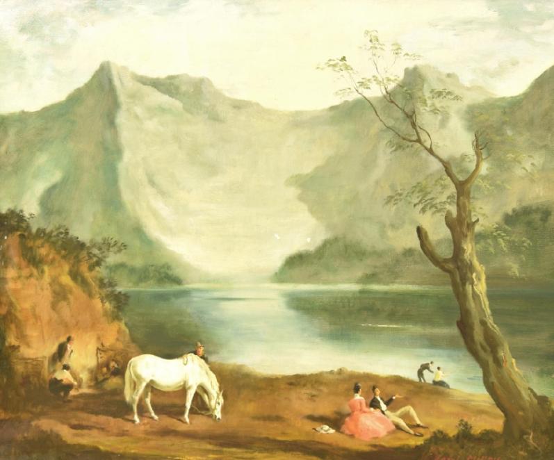 | Landscape with a white horse and an elegantly dressed couple beside a lake | |