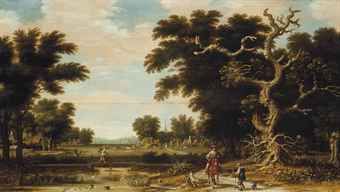 | An extensive wooded river landscape with a horseman on a track, a village beyond | |