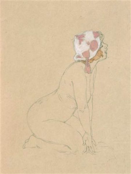 A drawing of a nude lady kneeling and wearing a pink and white bathing cap