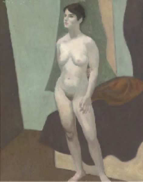 Female nude, standing in front of a bed