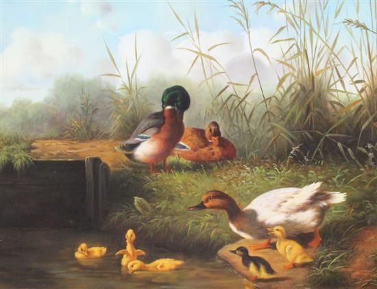 Ducks and ducklings beside a river