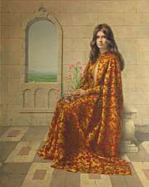 A girl in a red and gold cape seated in an interior