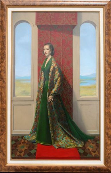 Portrait of a Woman in green velvet dress and embroidered brocade drape