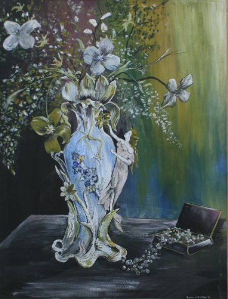 | Still life of floral arrangement in porcelain vase with figural female and overflowing jewel box | |
