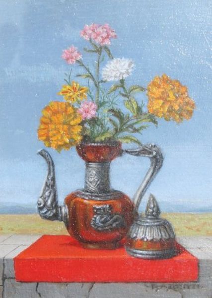 Still Life of Mums in a Persian Metal Teapot set in a vast landscape