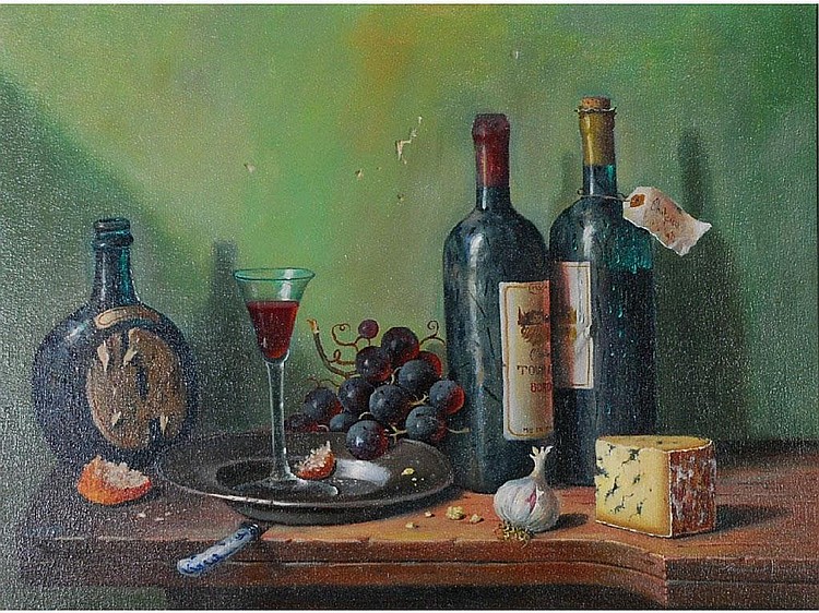 | Still life with wine bottles, wine glass, grapes and cheese on a table | |
