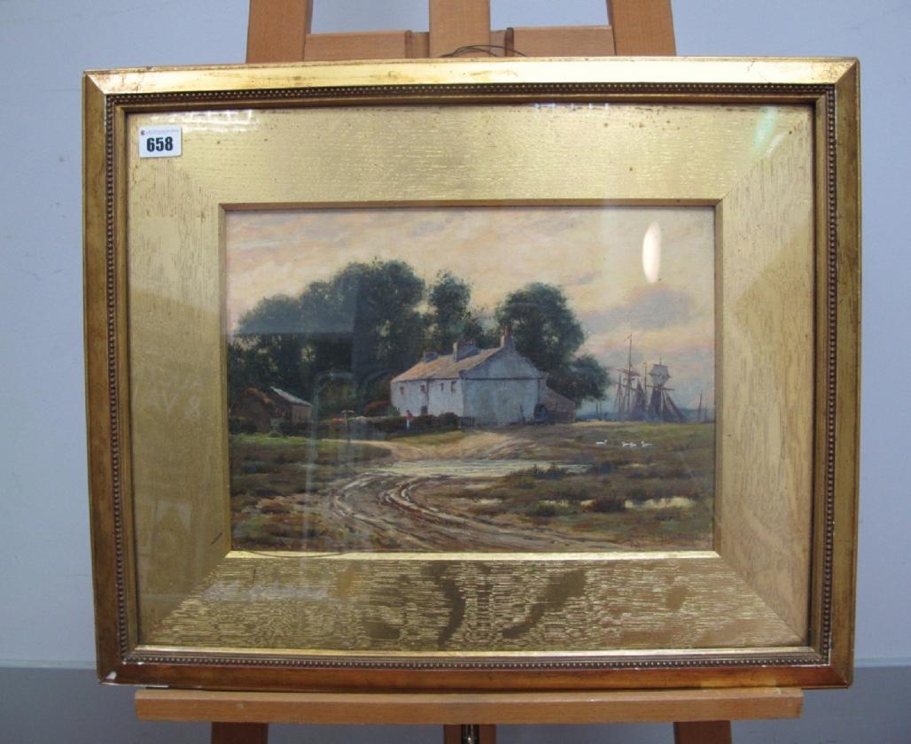 | Cottages Beside a Ford, with moored boats on a river beyond | |