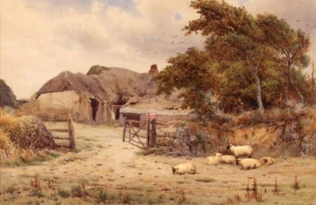 Sheep Resting Before Old Farm Buildings