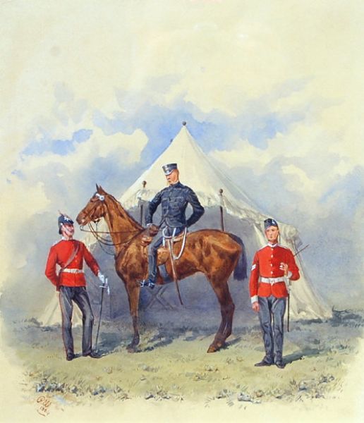 Mounted Officer, Sergeant and Corporal before a campaign tent