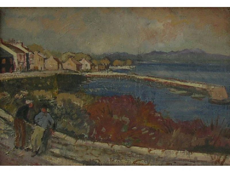 Scottish Coastal View with two figures in the foreground, harbour beyond