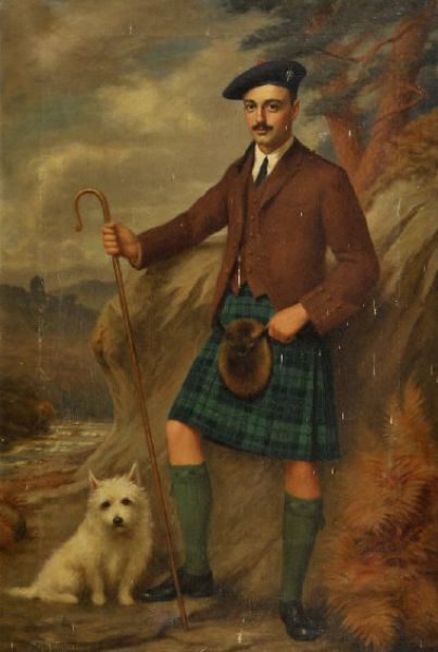 A full length portrait of a Scottish gentleman and West Highland terrier