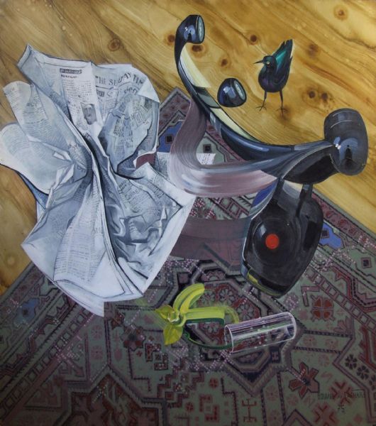 | Surreal still life with a telephone, daffodil, newspaper, carpet and bird | |