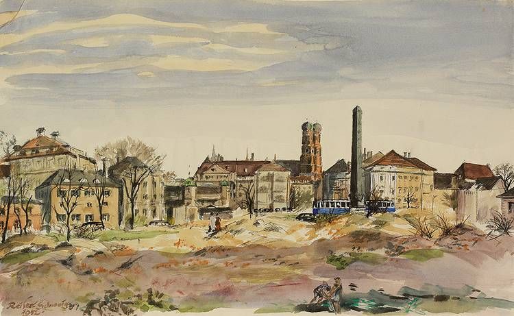 | Münchner Ansicht nach dem Krieg mit Trümmergrundstück, im Hintergrund Obelisk, Straßenbahn und Frauenkirche. | |