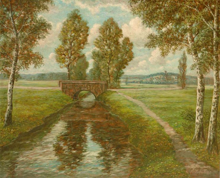 Frühlingslandschaft (bei Durlach?) mit Bachlauf, steinerner Brücke und Turmruine